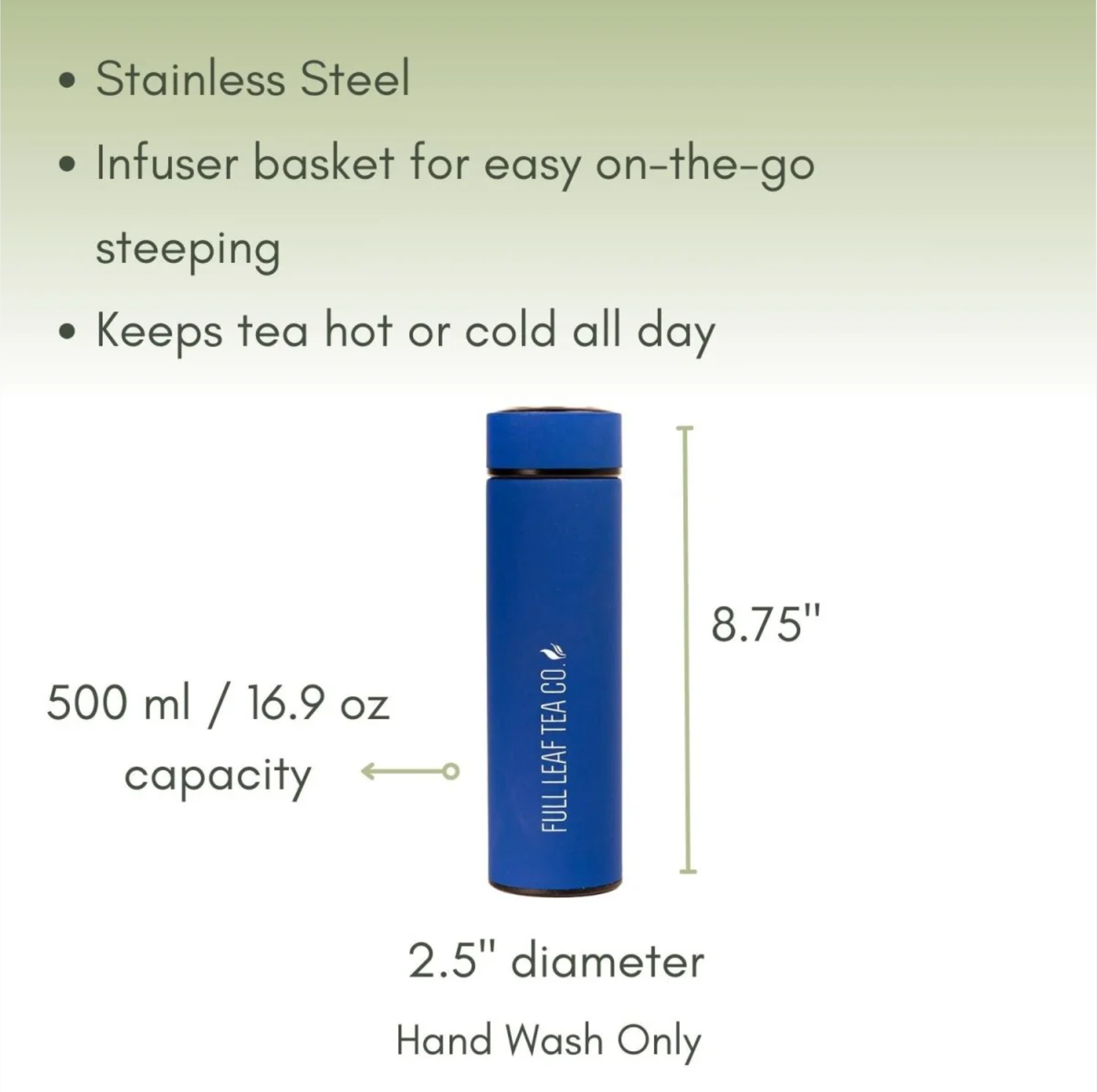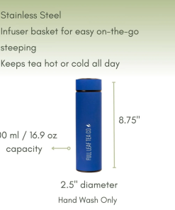 The Full Leaf Vacuum Flask Tea Infuser is our new favorite accessory! This bottle was designed to keep your tea hot for all-day enjoyment. Brew tea on the go with the sturdy infuser that secures inside the bottle or pour your already steeped tea directly inside for hours of perfect temperature tea. This vacuum flask is made of stainless steel making it the toughest teacup you’ll ever own. Designed with the Full Leaf logo and motto this bottle will surely lead to “pure joy, a clean life, and inspiring tea.”